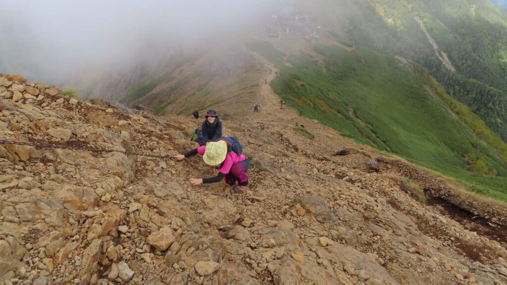 - ヘルメット、ストックは鎖場・岩場を安全に通過するために有用。