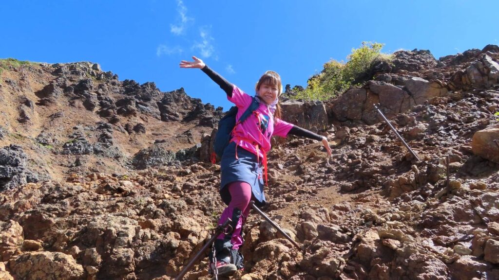 歩き方は、小股で重心を低くを意識すればOK。本格的なクライミングではないけれど、手と足を使う「3点支持」の岩登りが少しあります。岩場に慣れていない方は、事前に気持ちの準備があると安心です。