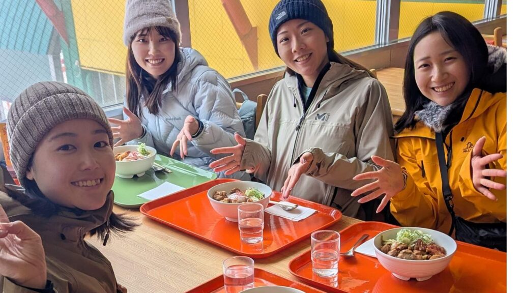 ゲレンデ内は本当に食事の選択肢が多く、挙げだすとキリがないのですが、とりあえず印象に残っているところを。みんなで『鶏ちゃん丼』をいただきました。
