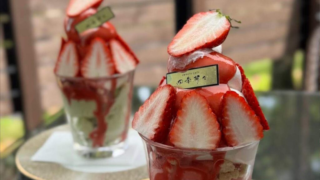 季節限定のいちごパフェは、ピスタチオアイスの香ばしさとたっぷりのいちご、ザクザク食感のクッキーが絶妙にマッチ。山歩きで疲れた体に、ほっと癒しがしみわたります🍓